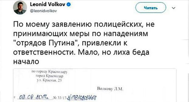 "По моему заявлению полицейских, не принимающих меры по нападениям "отрядов Путина", привлекли к ответственности. Мало, но лиха беда начало", - написал сегодня начальник предвыборного штаба Навального Леонид Волков на своей странице в соцсети Twitter. "По результатам проведения служебной проверки в действиях сотрудников ОБ ППСП №1 управления МВД России по городу Краснодару были усмотрены нарушения служебной дисциплины, в результате чего виновные должностные лица были привлечены к строгой дисциплинарной ответственности", - говорится в ответе городского управления МВД, опубликованном Волковым.