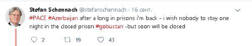 "Никому не пожелал бы оставаться в Гобустанской тюрьме ни на одну ночь, но скоро она будет закрыта", - написал Шеннак на своей странице в Twitter после посещения мест заключения.