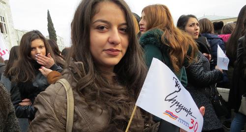 Митинг по случаю 30-летия карабахского освободительного движения. Нагорный Карабах.13 февраля 2018 год. Фото Алвард Григорян для "Кавказского узла""Задолго до этого активисты собирали подписи у жителей, желающих жить в составе матери-Армении. Но уже 13 февраля наши требования прозвучали громогласно... К сожалению, наше справедливое требование не было принято тогдашними властями... Мы должны, сохраняя дух 1988 года, заявить, что мы будем жить на своей земле и защищать ее. Мы будем жить в своей независимой стране, и, конечно же, с Арменией", - сказала Мхитарян.