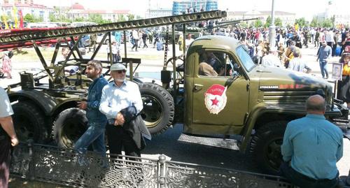 Масштабный военный парад, посвященный 73 годовщине победы в Великой Отечественной войне, был назначен на 10 часов утра, однако прохождение пеших колонн и военной техники началось с двухчасовым опозданием. Перед его началом военные разрешали детям и взрослым фотографироваться рядом и внутри боевой техники. Впервые на параде в составе колонны военной техники проследовали несколько единиц боевых багги "Чаборз", выпускаемых в Чечне. Кроме того, в параде были задействованы тяжелые военные грузовики на базе "КамАЗа" И "ЦРА", а также установки залпового огня "Град", БМП, БТР, бронемашины "Тигр" и другая военная техника. В авангарде военной колонны следовали джип времен Великой Отечественной войны и установка "Катюша" с бутафорскими ракетами на направляющих, передает корреспондент "Кавказского узла"