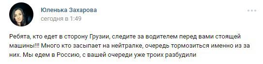 "Ребята, кто едет в сторону Грузии, следите за водителем перед вами стоящей машины!!! Много кто засыпает на нейтралке, очередь тормозиться именно из-за них. Мы едем в Россию, с вашей очереди уже троих разбудили", - сообщила Юленька Захарова.
