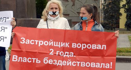 Участник митинга Дмитрий Филиппов рассказал корреспонденту "Кавказского узла", что его семья взяла ипотеку в конце 2016 года. "Жена была беременная, хотели в 2017 году переехать в новую квартиру, но до сих пор ждем жилье, – отметил мужчина. – Ребенку уже полтора года. Платим ипотеку 15 тысяч в месяц, живем с родителями, ютимся. За жилье боремся уже три года. Пока ничего не можем добиться. Никто не может нам помочь, все закрывают на нас глаза. Повязки у нас сегодня означают, что мы кричим, а власть нас не слышит".