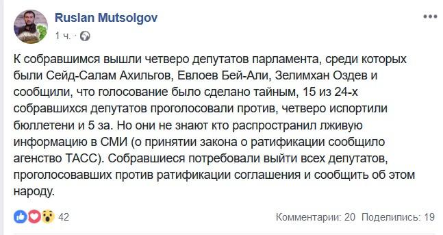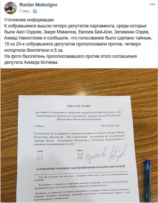 "К собравшимся вышли четверо депутатов парламента, среди которых были Сейд-Салам Ахильгов, Евлоев Бей-Али, Зелимхан Оздев, и сообщили, что голосование было сделано тайным, 15 из 24 собравшихся депутатов проголосовали "против", четверо испортили бюллетени и 5 "за". Собравшиеся потребовали выйти всех депутатов, проголосовавших против ратификации соглашения и сообщить об этом народу", - написал сегодня в своем аккаунте в соцсети Facebook глава отделения "Яблока" Руслан Муцольгов.