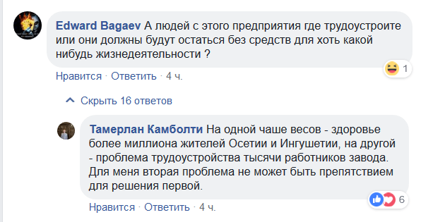 Пользователь Edward Bagaev задал Камболову вопрос о проблеме трудоустройства сотрудников "Электроцинка", которые после его закрытия останутся без работы. "На одной чаше весов - здоровье более миллиона жителей Осетии и Ингушетии, на другой - проблема трудоустройства тысячи работников завода. Для меня вторая проблема не может быть препятствием для решения первой", - написал Камболов.