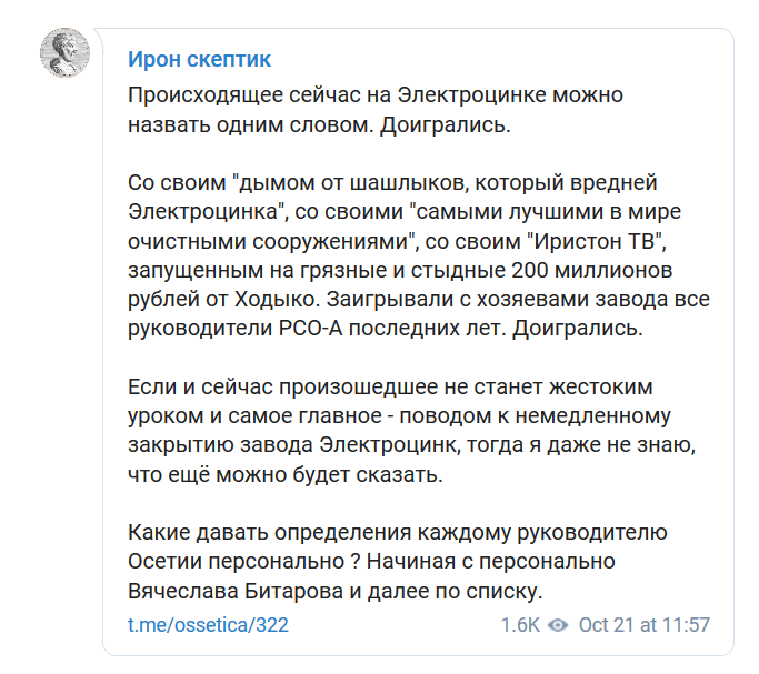 Осетинский блогер отметил, что с хозяевами завода "заигрывали все руководители республики последних лет". "Происходящее сейчас на Электроцинке можно назвать одним словом. Доигрались. Со своим "дымом от шашлыков, который вредней "Электроцинка", со своими "самыми лучшими в мире очистными сооружениями", со своим "Ирыстон ТВ", - говорится в его публикации.