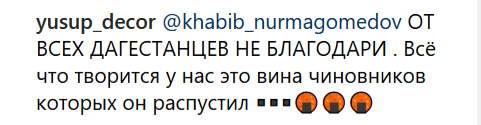 "От всех дагестанцев не благодари. Все, что творится у нас, это вина чиновников, которых он распустил", - написал yusup_decor.