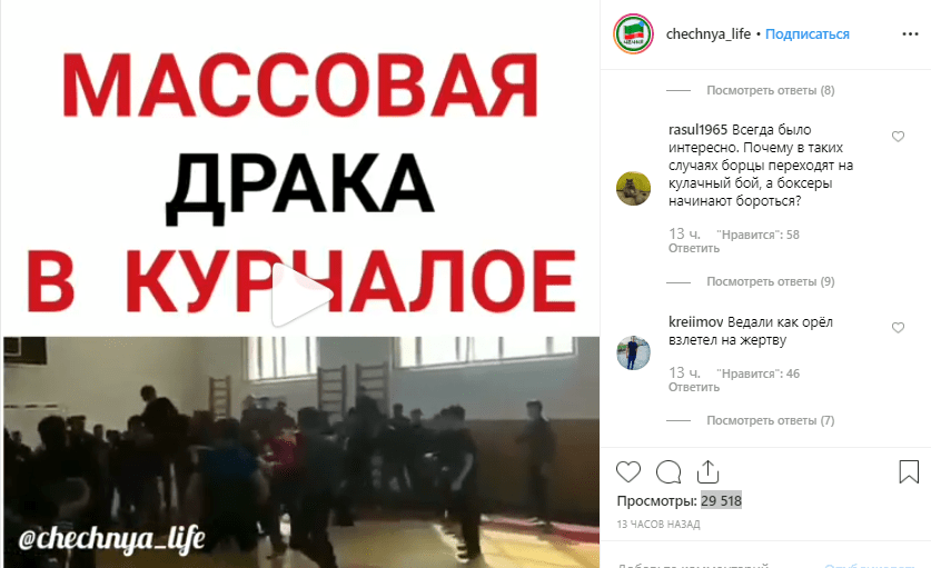 Видеозапись инцидента 3 апреля опубликована в Instagram-аккаунте chechnya_life. К 07.20 мск 4 апреля она собрала 29 929 просмотров и 183 комментария. В ролике видно, как болельщики начали драку после конфликта спортсменов.