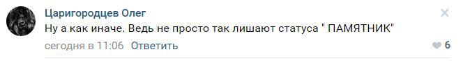 Пользователей соцсетей новость о снятии статуса памятника со стелы также возмутила. "А как иначе? Ведь не просто так лишают статуса памятника", - написал Олег Царигородцев в ответ на новость о возможной застройки Театральной площади.