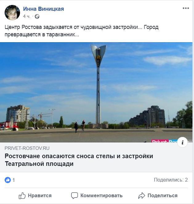 "Центр Ростова задыхается от чудовищной застройки", - прокомментировала Инна Виницкая на своей личной странице в Facebook новость о возможном сносе стеле и последующей застройке площади. Пост был выложен сегодня около 12.00 мск и к 15.15 мск был два раза перепощен.