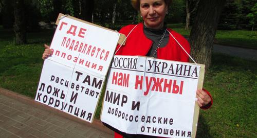 Тамара Гродникова держала плакаты "Россия – Украина. Нам нужны мир и добрососедские отношения" и "Где подавляется оппозиция, там расцветают ложь и коррупция". "Если мы хотим добрососедских отношений с нашим братским народом, мы должны не паспорта им раздавать, что только обостряет конфликт, а оказывать реальную помощь. Во-первых, вывести войска с Донбасса, продавать Украине природный газ по льготным ценам, начать политический диалог на равных, без угроз", - заявила пикетчица корреспонденту "Кавказского узла".