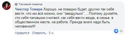 "Хорошо, не повадно будет, другим так себя вести, что им всё можно, они "звездульки".... Поэтому думайте, кто себя таковыми считают, как себя вести везде, в семье, в общественном месте, на работе. Прежде всего надо быть человеком!!!" - написала Чекстер Томара.