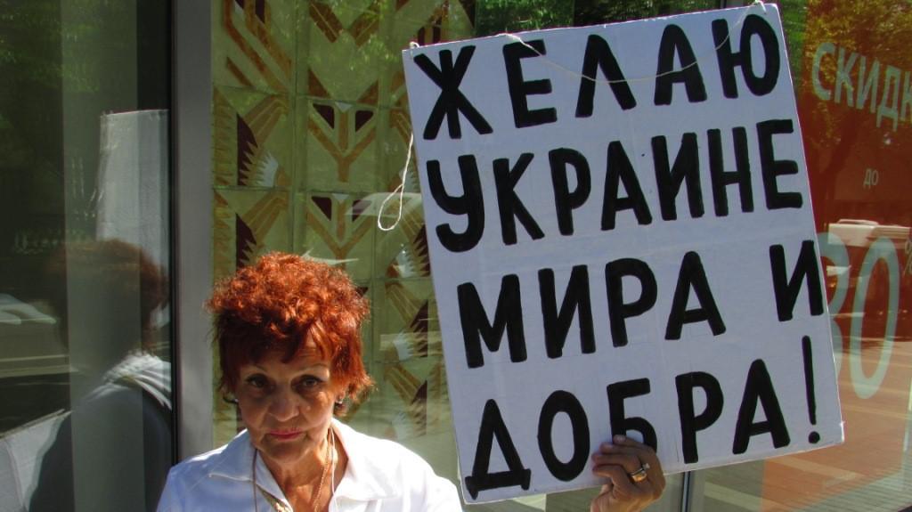Пенсионерка из Волжского Галина Тихенко демонстрировала прохожим плакаты: «Желаю Украине мира и добра», «Нет войне», «Хочу как в Украине честные выборы», «Пираты Азовского моря, освободите украинских моряков».