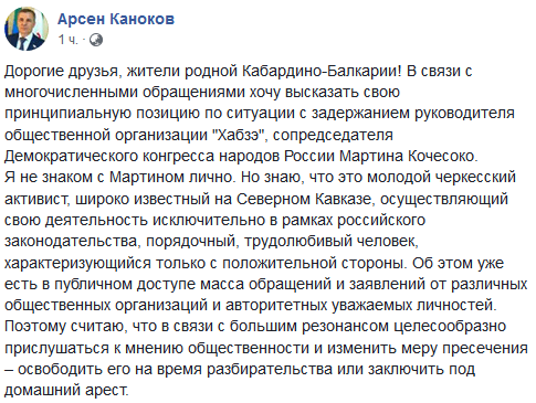 Сообщение о том, что Арсен Каноков на своей странице в ФБ сделал заявление по ситуации с Мартином Кочесоко, поступило на смс-сервис "Кавказского узла". "Он готов предоставить адвоката и свое поручительство", - написал автор сообщения.