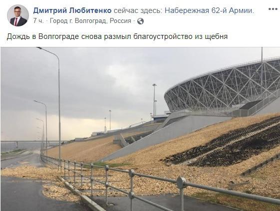 Размыв склона у стадиона "Волгоград Арена" произошел из-за того, что ливневая канализация не справилась с недельной нормой осадков, выпавшей в областном центре в течение нескольких часов, сообщила мэрия Волгограда. Смыв грунта и щебня у стадиона происходит после каждого сильного дождя, а возмещать ущерб приходится за счет городского бюджета, заявили местные жители в Facebook.