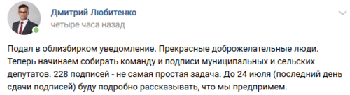 Дмитрий Любитенко сообщил сегодня о подаче документов на своей странице в "ВКонтакте". "Подал в облизбирком уведомление. Прекрасные доброжелательные люди. Теперь начинаем собирать команду и подписи муниципальных и сельских депутатов. 228 подписей - не самая простая задача", - написал он.