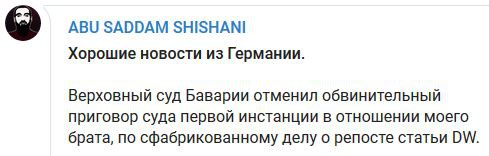 Верховный суд Баварии отменил обвинительный приговор Мохмаду Абдурахманову по делу о репосте статьи Deutsche Welle, сообщил поздно вечером Тумсо Абдурахманов в своем Telegram-канале.