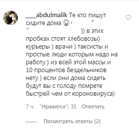 "В этих пробках стоят хлебовозы, курьеры, врачи, таксисты и простые люди, которым надо на работу. Из всей этой массы и 10 процентов бездельников нет. Если они дома сидеть будут, вы с голоду помрете быстрей, чем от коронавируса", - прокомментировал пользователь Instagram ____abdulmalik видео, опубликованное 29 апреля в сообществе mkala_, насчитывающем 396 тысяч подписчиков. На видеоролике под названием "Ситуация на дорогах Махачкалы" из окна проезжающей по соседней полосе машины видна пробка из нескольких десятков машин, среди них - автомобиль скорой помощи. К 23.40 мск видео посмотрели 26,9 тысячи раз, под ним оставили 66 комментариев.