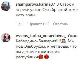 "У нас тоже воды нет в Атажукино", - написала dzhulettatezadovaa. "В Баксане такая же история", - написала larisaguchinova. "Ужас, Кабардино-Балкария!!!! Мы под Эльбрусом, и нет воды, что вы делаете с жителями республики", - поделилась возмущением essens_karina_nuraedovna_.