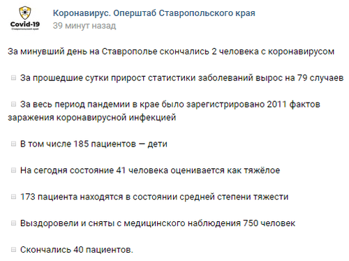 За прошедшие сутки было выявлено 79 новых случаев заражения коронавирусом, число инфицированных в крае возросло до 2011, из них 185 - дети, сообщил на своей официальной странице "ВКонтакте" оперативный штаб Ставропольского края.