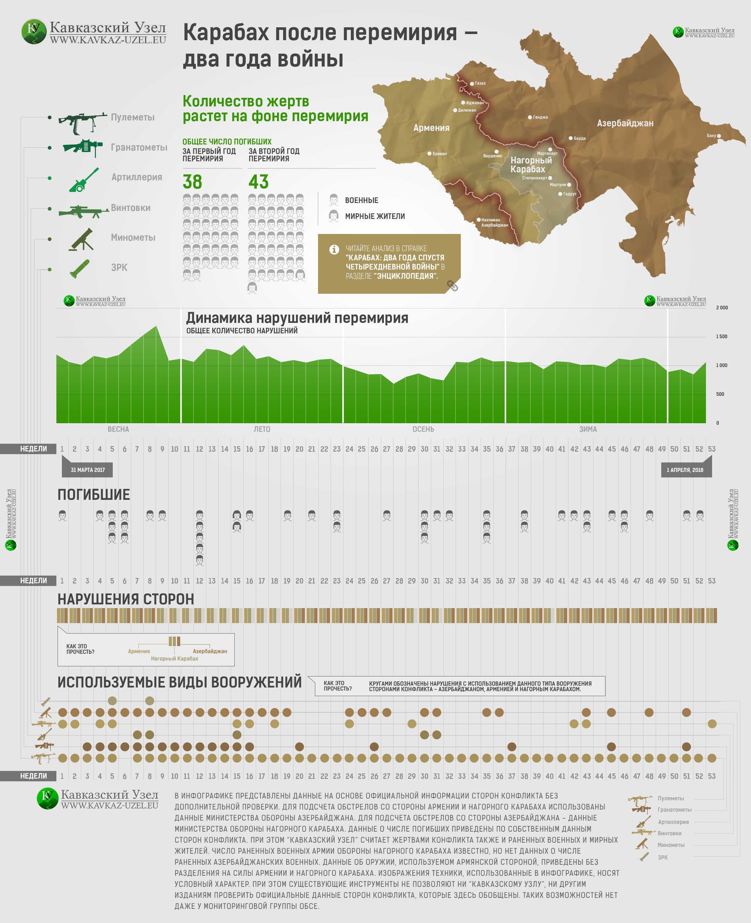 Установившееся после "четырехдневной войны" формальное перемирие ни на один день не остановило противостояние, и на линии разграничения не затихала стрельба, гибли люди. Так, за первый год перемирия погибли 38 человек, за второй год перемирия - 43 человека, в том числе 41 военный и двое мирных жителей, следует из собственных данных сторон конфликта, обобщенных "Кавказским узлом" в инфографике "Карабах после перемирия - два года войны".