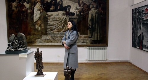 Посетители рассматривают экспонаты выставки "Алания: образы прошлого". Владикавказ, 27 ноября 2020 года. Фото Тамары Агкацевой для "Кавказского узла"."В номинации «Сюжетная картина о христианской истории Алании, Крещении страны, подвигах православных подвижников и святых» I место – Вадим Каджаев, II место – Заурбек Дзанагов, III место – Оллана Айларова. В номинации «Историческая сюжетная картина об истории Алании-Осетии» I место - Сослан Баскаев, II место - Зинаида Кулиева, III место – Мурат Джикаев. В номинации «Портрет исторического персонажа» I место - Игорь Лотиев, II место - Вадим Пухаев, III место - Алан Корнаев. Дипломы победителям конкурса на торжественной церемонии награждения вручила заместитель министра культуры Дзерасса Дзлиева", - говорится в публикации на странице министерства в Instagram.