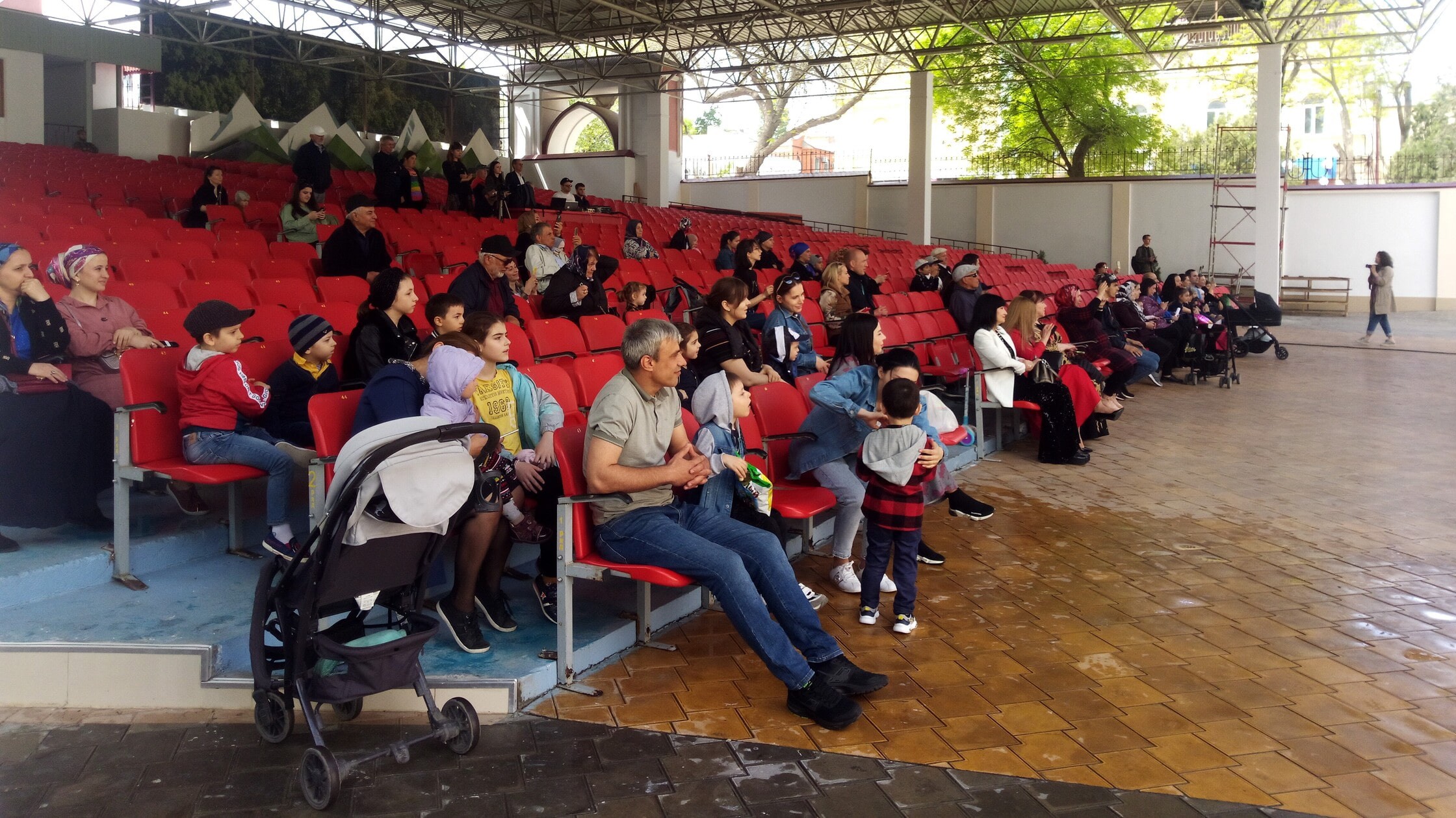 Концерт на Первомай на летней эстраде дагестанской филармонии. 2021 год. Фото Расула Магомедова для "Кавказского узла"На летней площадке Дагестанской государственной филармонии сегодня прошел концерт. Вход был свободный, однако сидячие места были заполнены меньше, чем наполовину. Люди старались рассаживаться с соблюдением дистанции, но маски никто не носил. На входе была установлена рамка металлоискателя.
