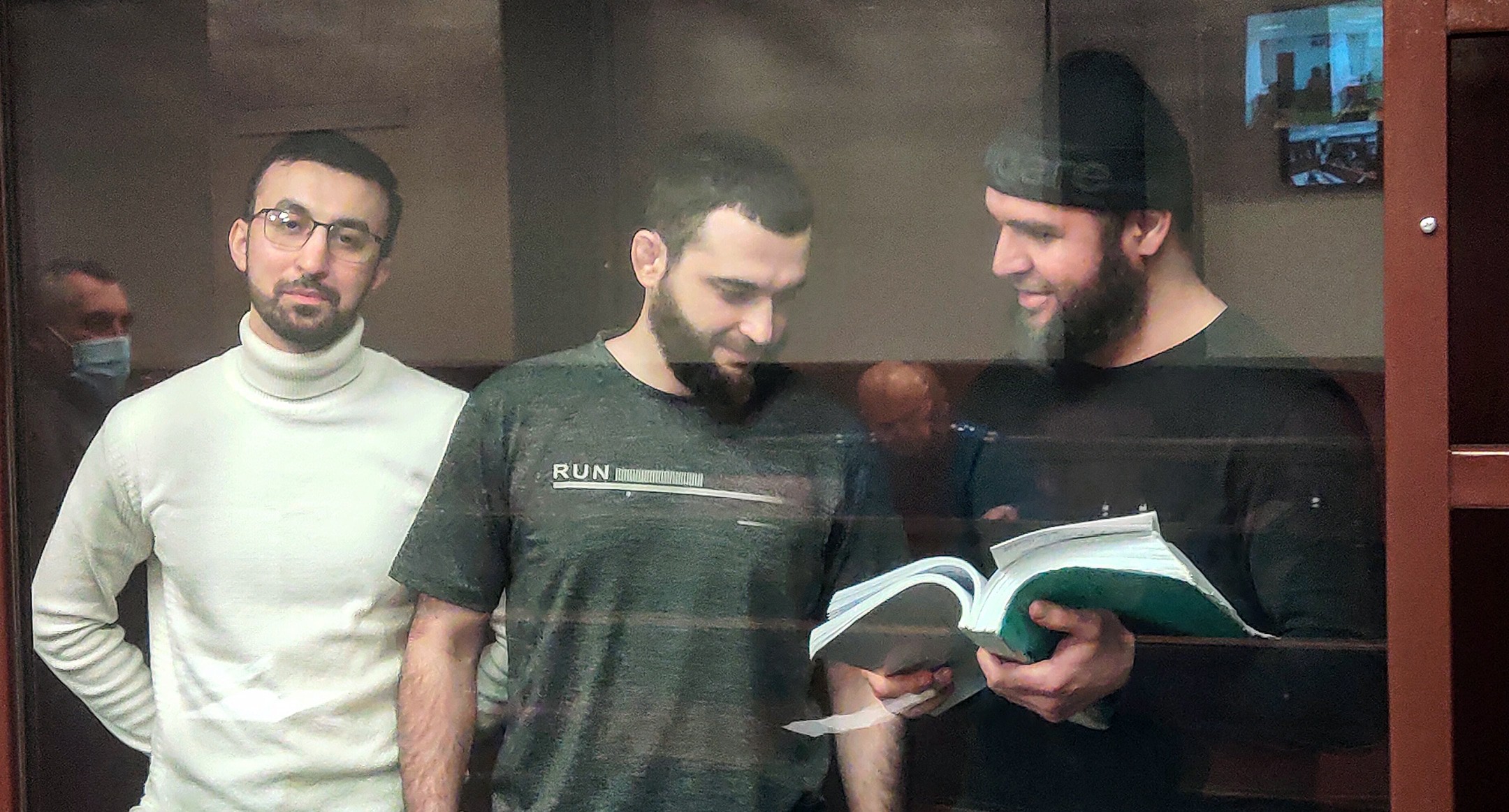 Сегодня был допрошен свидетель обвинения Мурат Кусигаджиев. В начале заседания конвоиры завели его в клетку-"аквариум", отделенную от подсудимых бронированным стеклом. Кусигаджиев, мужчина с бородой в спортивном костюме, рассказал, что он родился в 1985 году в селе Бабаюрт в Дагестане, проживал там же, имеет высшее образование, женат, у него есть четверо малолетних детей.