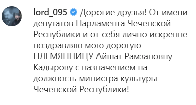 "От имени депутатов парламента Чеченской Республики и от себя лично искренне поздравляю мою дорогую племянницу Айшат Рамзановну Кадырову с назначением на должность министра культуры Чеченской Республики", - написал он на странице lord_095.
