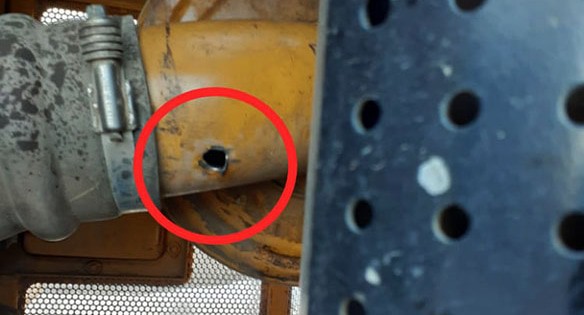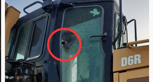 Публикация проиллюстрирована серией фотографий, на которых показаны разбитые стекла грузовика и трактора, а также круглые отверстия в кузовах и окнах машин.