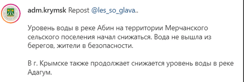 Вода в реке Абин в селе Мерчанском не вышла из берегов, ее уровень снижается, говорится в сегодняшнем сообщении на странице администрации Крымского района adm.krymsk в Instagram. Опасности подтопления в населенном пункте нет, отмечается в сообщении. Снижается уровень воды и в реке Адагум в Крымске, говорится в сообщении администрации.