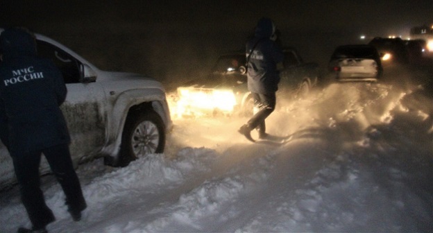 "Десятки автовладельцев, вынужденные по тем или иным причинам совершать поездки в условиях непогоды, минувшей ночью оказались во власти стихии. Так, две машины, в которых находились шесть человек, в том числе двое детей, глубоко увязли в снежных заносах на проселочной дороге между Кировским и Советским районами областного центра", - проинформировало ГУ МЧС по Ставропольскому краю.