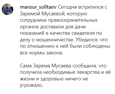 "Сегодня (21 января) встретился с Заремой Мусаевой, которую сотрудники правоохранительных органов доставили для дачи показаний в качестве свидетеля по делу о мошенничестве. Убедился, что по отношению к ней были соблюдены все нормы закона. Сама Зарема Мусаева сообщила, что получила необходимые лекарства и её жизни и здоровью ничего не угрожало", - сообщил он в аннотации к видеоролику.