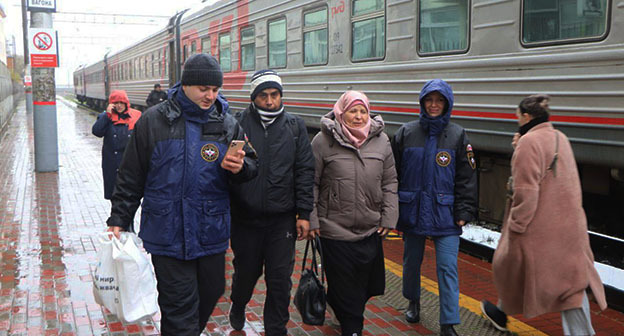 Как следует из фотографий, приложенных к сообщению, сотрудники МЧС встретили мужчину и женщину у поезда, помогли им выгрузить вещи и проводили в пункт временного размещения.