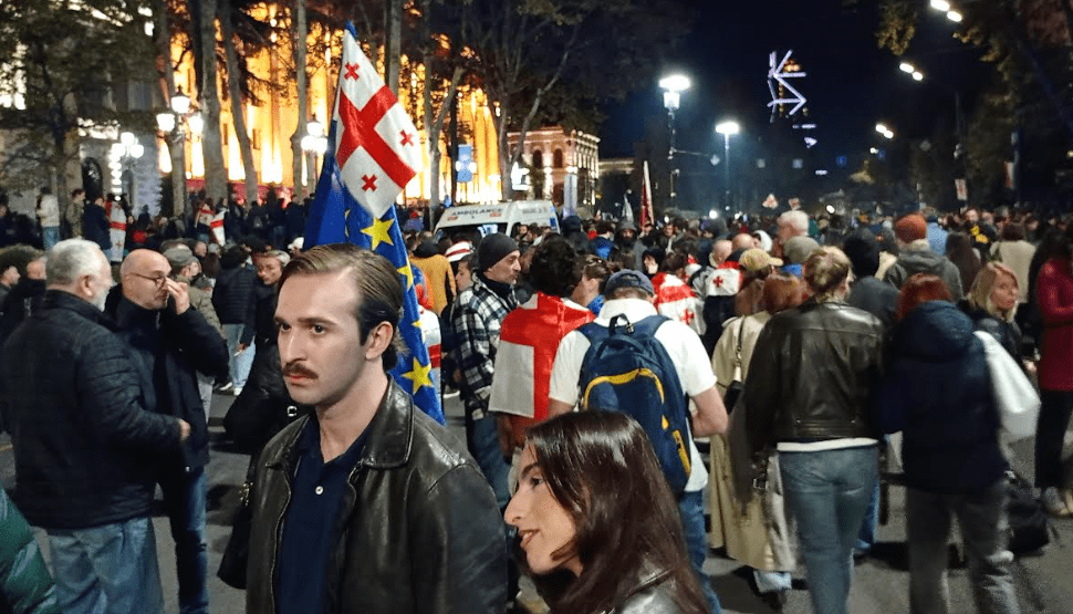 Жители Грузии, не согласные с озвученными итогами выборов, вышли на массовый митинг в Тбилиси и перекрыли проспект Руставели. В акции участвуют тысячи людей, сообщает на своем сайте телеканал "Пирвели".