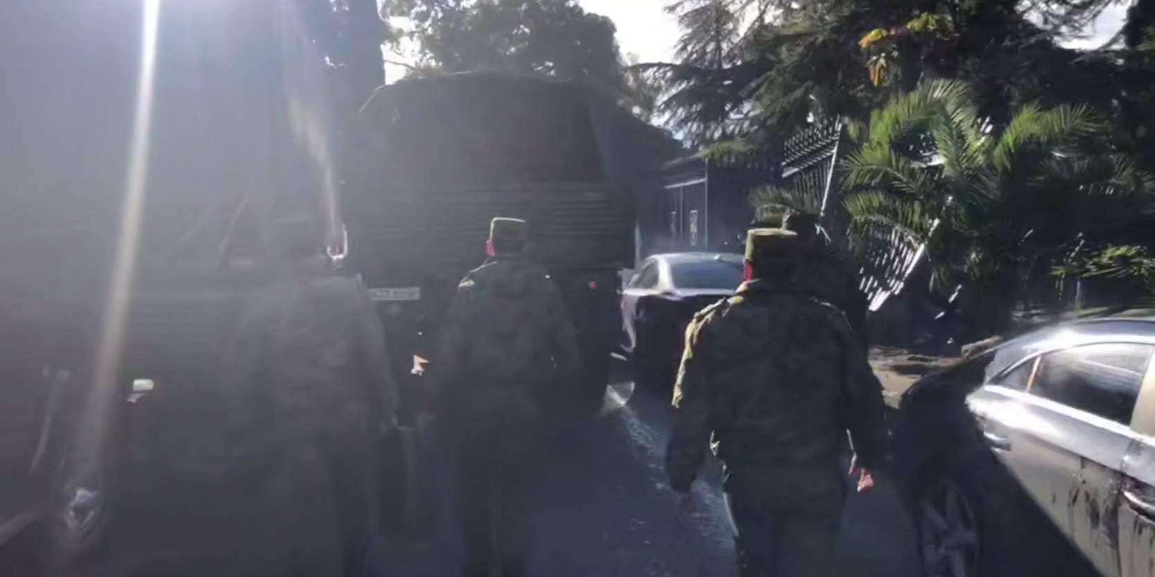 На кадрах видео показан военный грузовик, медленно едущий по проезжей части, и идущие за ним четыре человека в камуфляжной одежде. Двое из них несут канистру.