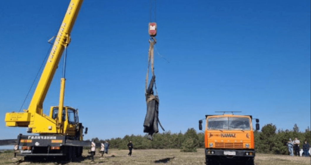 Скульптура в кузове грузовика. Скриншот фото из Telegram-канала Всероссийского казачьего общества от 04.05.25, https://t.me/vskoru/11793.К сообщению приложены фотографии, на которых видно, как памятник снимают с постамента,  а также лежащую в кузове грузовика скульптуру