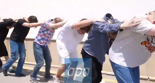 Как следует из размещенных APA видео и фото, у стены здания стоит не менее восьми человек. Как минимум у двоих из них следы побоев на лице, у двоих, одетых в светлые футболки, на футболках видна кровь. Силовики с закрытыми лицами уложили задержанных лицом на землю, а затем с низко наклоненными головами отвели их в автомобиль.