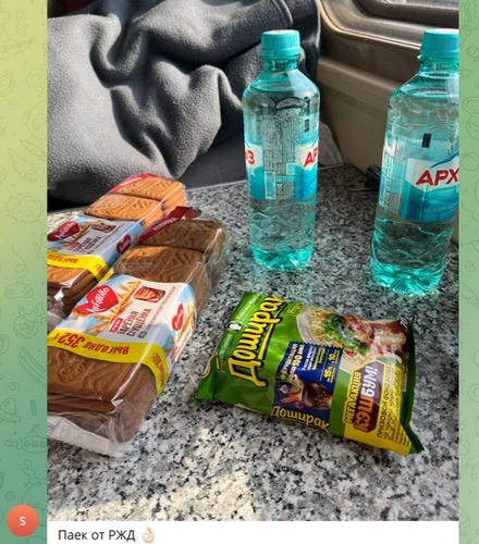 "Поезд, который вышел 19 июля из Новороссийска в 09.50, идет с задержкой в семь часов", - сообщил в 08.08 мск Santiago. Он также опубликовал фото размещенных на столике в вагоне двух бутылок с водой, двух упаковок печенья и упаковки лапши "Доширак". "Паек от РЖД", - пояснил пользователь.