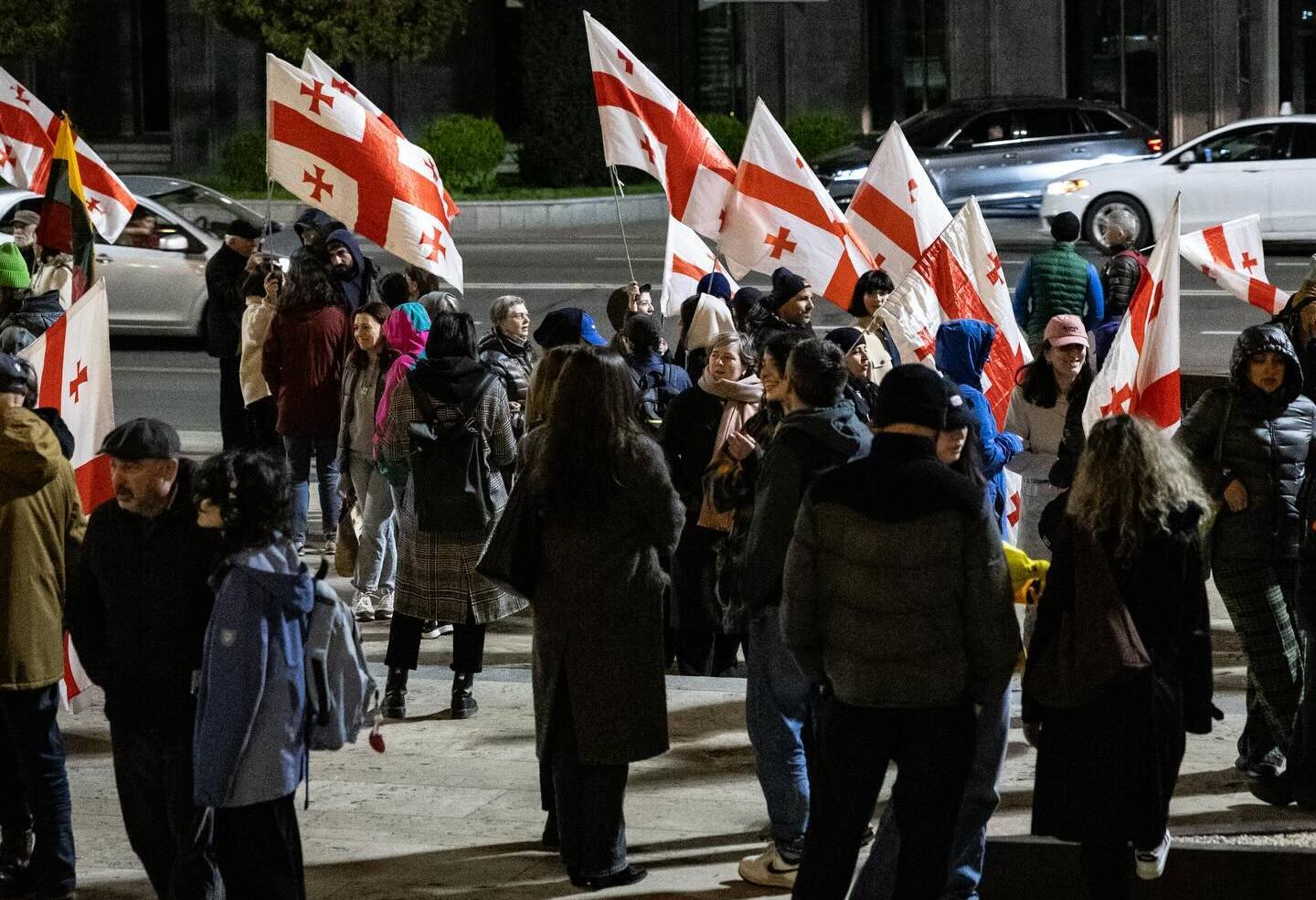 Участники ежедневной акции протеста у парламента Грузии сегодня вечером собрались на проспекте Руставели в 509-й день подряд. Активисты принесли с собой национальные флаги, у некоторых из протестующих были флаги Евросоюза, США и Литвы. В собрании участвовали не менее 30 человек, следует из публикаций фотографа Mo Se и грузинских медиа в Facebook*.