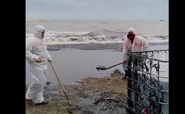Обратите внимание, убирают нефтепродукты лопатами и без респираторов, прокомментировал видео в своем Telegram-канале эколог Жора Каваносян.