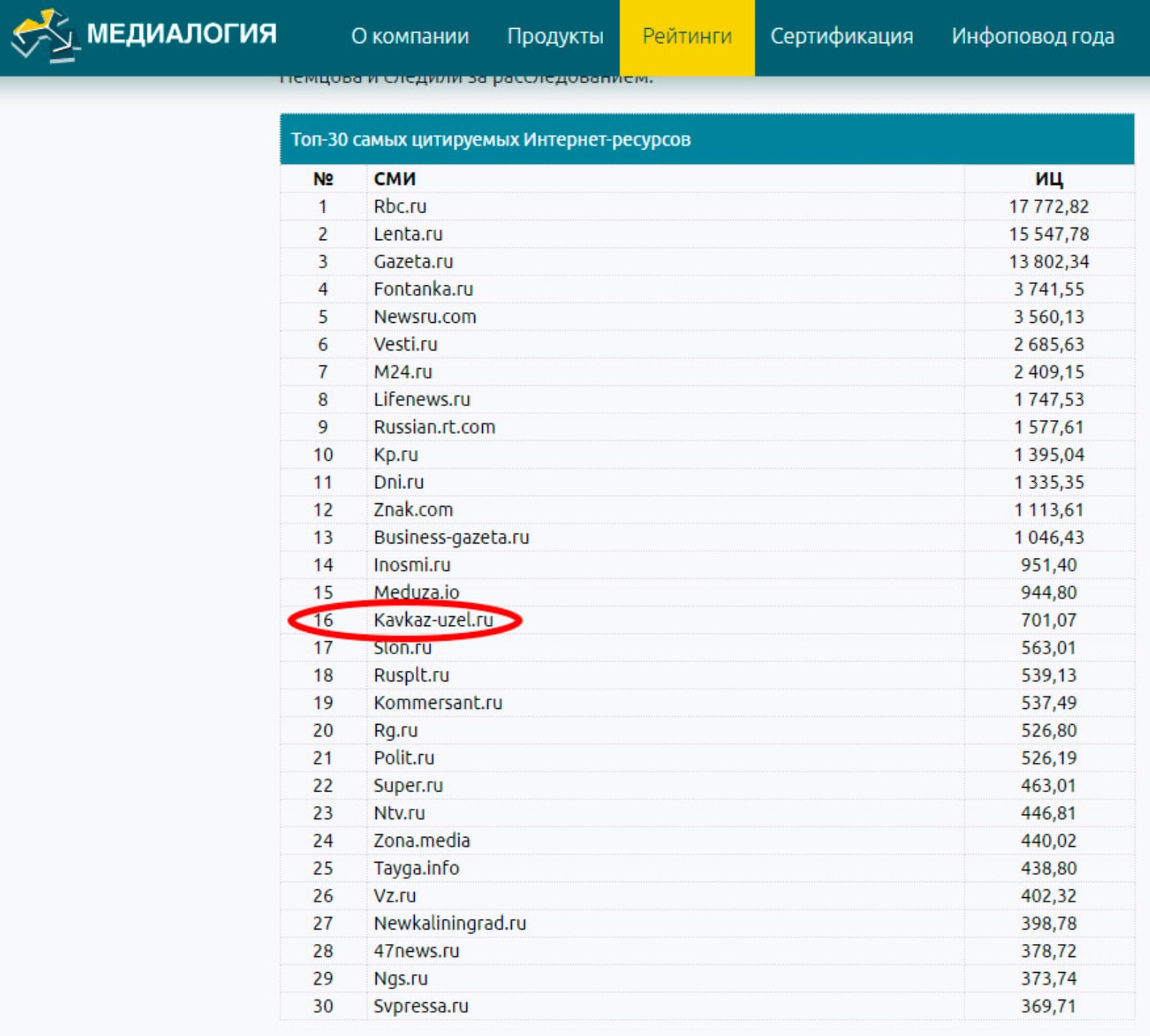 По данным Медиалогии входит в 30 самых цитируемых Интернет-СМИ России.