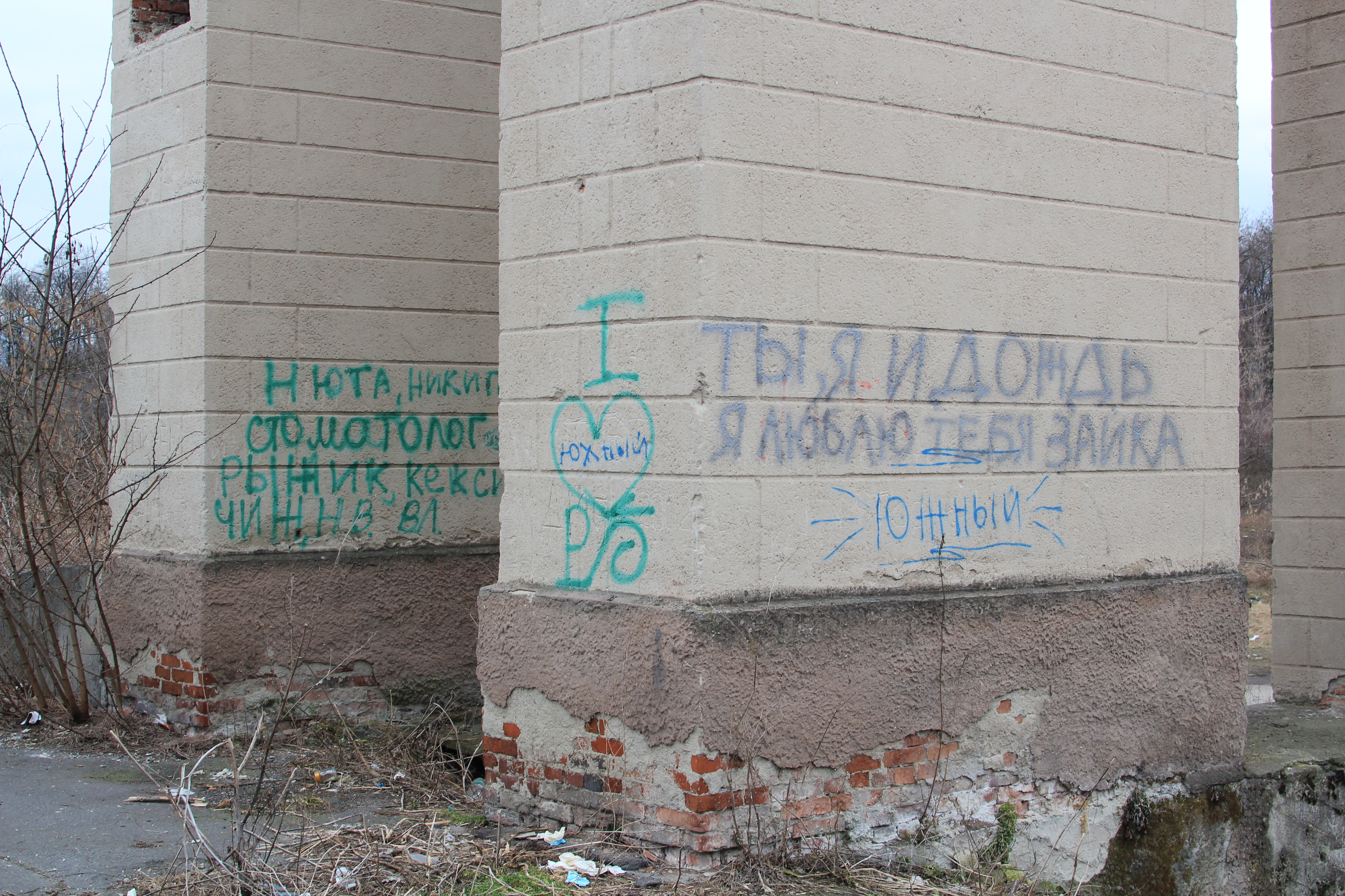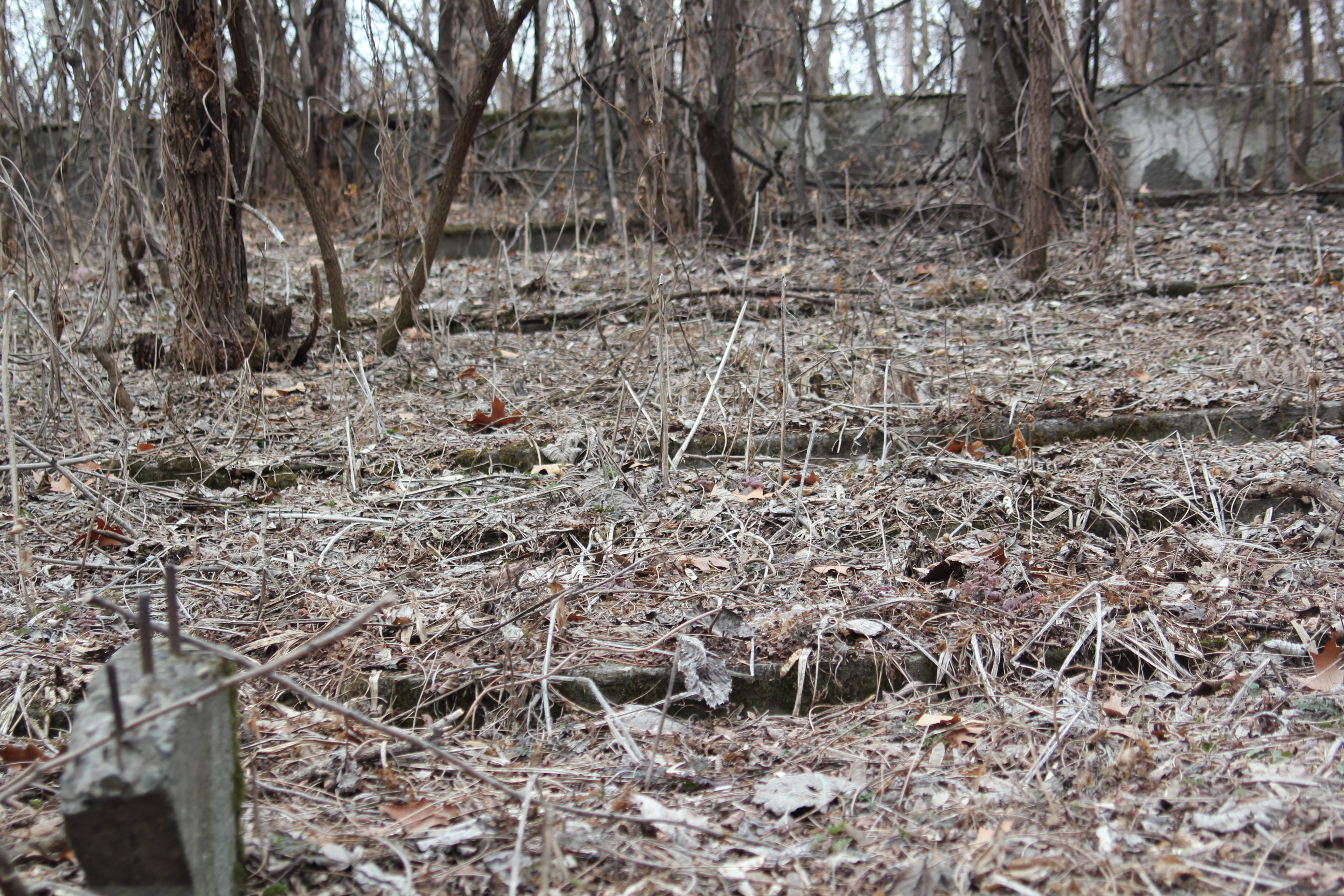 ну и несколько фотографий того, в каком состоянии сейчас находится "летний театр". в принципе, от него остался только этот вход, все остальное поросло лесом, сквозь который с трудом угадываются фрагменты трибуны и сцены.