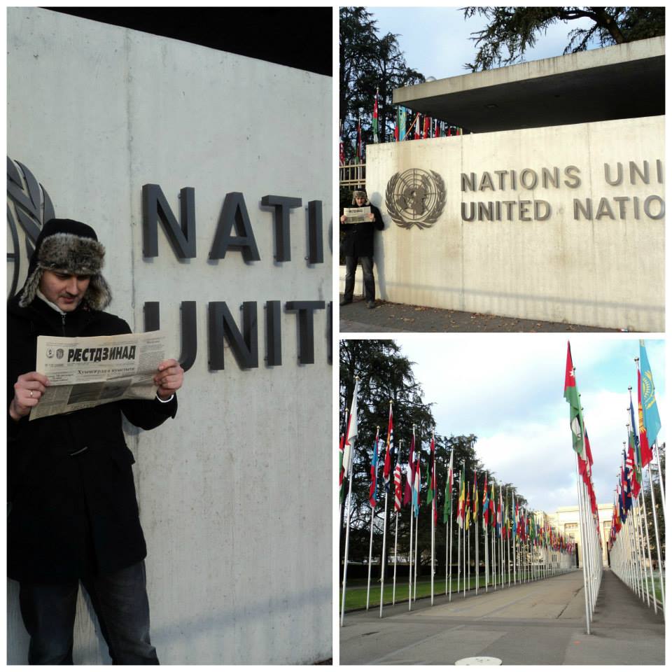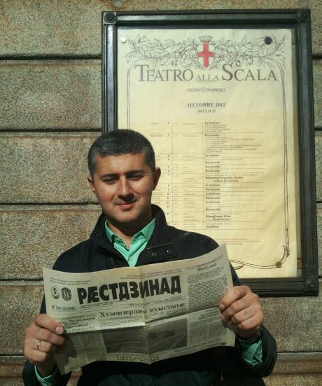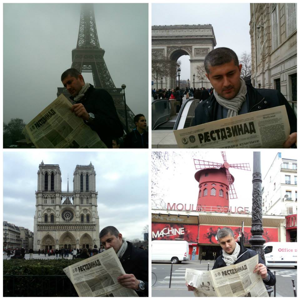 у одного моего другана, Авто Валиева, есть такая забава - фотографироваться на фоне всемирно известных мест с североосетинской газетой Раестдзинад в руках. веселый прикол, не более. но я подумал, отличная идея для рекламной компании газеты, как раз недавно писали, что у них опять падают тиражи, газета в кризисе. а тут человек ездит по Европе, но нигде не расстается с любимой газетой на осетинском языке.
