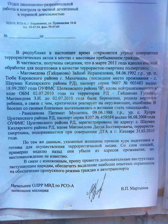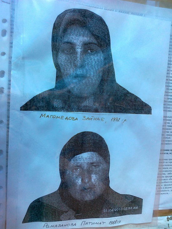 стою недавно жду кого-то на "Глобусе", в районе многострадальной "Дружбы". начал читать от безделья, оказалось вот, подозреваемые смертницы. недавно пропали из дома, в Дагестане. правда не стоит дата на документе. в общем, прочитал и поспешил отойти оттуда, дорогу перешел и там уж друга дожидался. все же сохраняется этот страх теракта внутри. не то, чтобы часто об этом думаю, но иногда в маршрутке Дружбу проезжаешь и вдруг вспомнишь, нехорошо становится, хочется быстрей это место проехать.