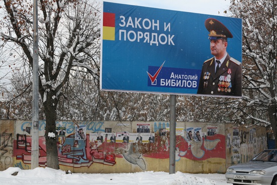 9:30 - проехали туннель. на это стороне идет снег. встречает баннер с портретом Бибилова в генеральской форме. наверху слоган "Закон и порядок". Такой же щит возле села Ванел. Джиоевой пока не видно. в селе Верхний Рук решили не останавливаться, там пока пусто. возможно слишком рано.