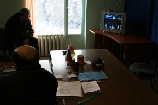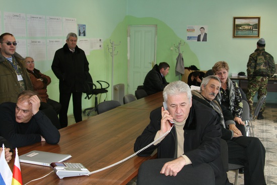 по местным новостям начинают показывать запись того как голосовали Бибилов, а потом Джиоева. народ в штабе оживляется, подтягивается к телевизору. когда показывают Джиоеву члены штаба отпускают несколько язвительных замечаний. впрочем, не особо злобных.