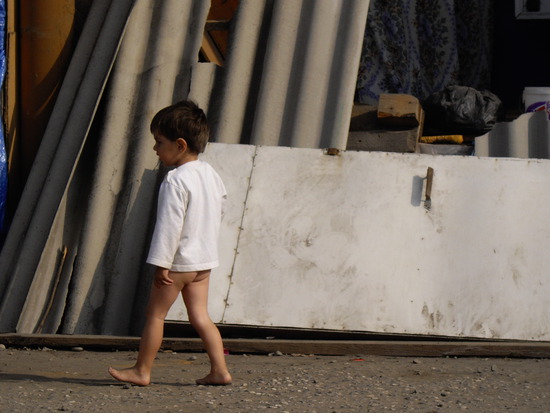 В Назрани мы посетили городок беженцев «Ангушт», расположенный по улице Муталиева, 35.  То, что  мы увидели, мало напоминало городок. Похожие на лачуги жилища. Большая  часть территории усыпана щебнем. У входа в городок  стоял малыш, который держал в руке ломоть хлеба. Я подумала: вот  оно босоногое и бесштанное военное детство. Над  крышами этих жалких жилищ виднелась  труба, которая выбрасывала серую пыль. Малыш  стоял и смотрел на нас, но  когда увидел в моих руках фотоаппарат,  испугавшись, бросился бежать  по  острым камням к  двери  своего «дома».