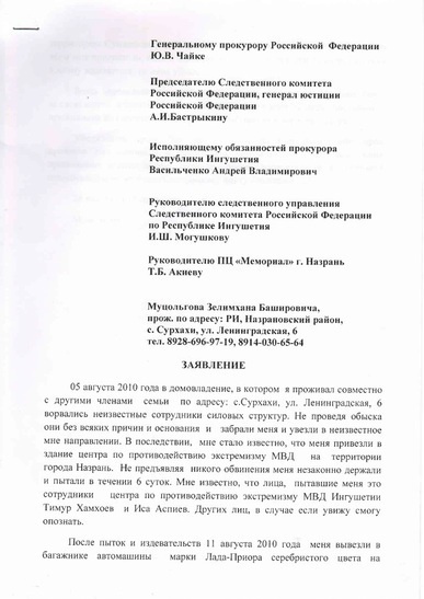 05 августа 2010 года в домовладение, в котором я проживал совместно с другими членами семьи по адресу: с.Сурхахи, ворвались неизвестные сотрудники силовых структур. Не проведя обыска, они без всяких причин и основания, забрали меня и увезли в неизвестное мне направлении. В последствии, мне стало известно, что меня привезли в здание Центра по противодействию экстремизму МВД на территории города Назрань. Не предъявляя никого обвинения меня незаконно держали и пытали в течение 6 суток. Мне известно, что лица, пытавшие меня это сотрудники центра по противодействию экстремизму МВД Ингушетии Тимур Хамхоев и Иса Аспиев. Других лиц, в случае если увижу, я смогу опознать.