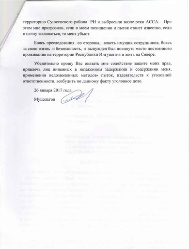 Опасаясь преследования со стороны, сотрудников силовых структур, боясь за свою жизнь и безопасность, я вынужден был покинуть место постоянного проживания на территории Республики Ингушетия и жить на Севере.