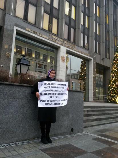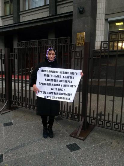 В Москве у органов государственной власти, прошли одиночные пикеты, с требованием освободить задержанного в Ингушетии молодого человека. Аза Хамхоева, мать задержанного в Ингушетии 14 ноября Альберта Хамхоева просит восстановить права ее сына.
